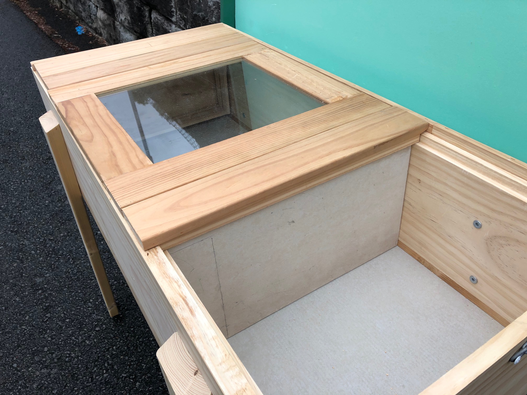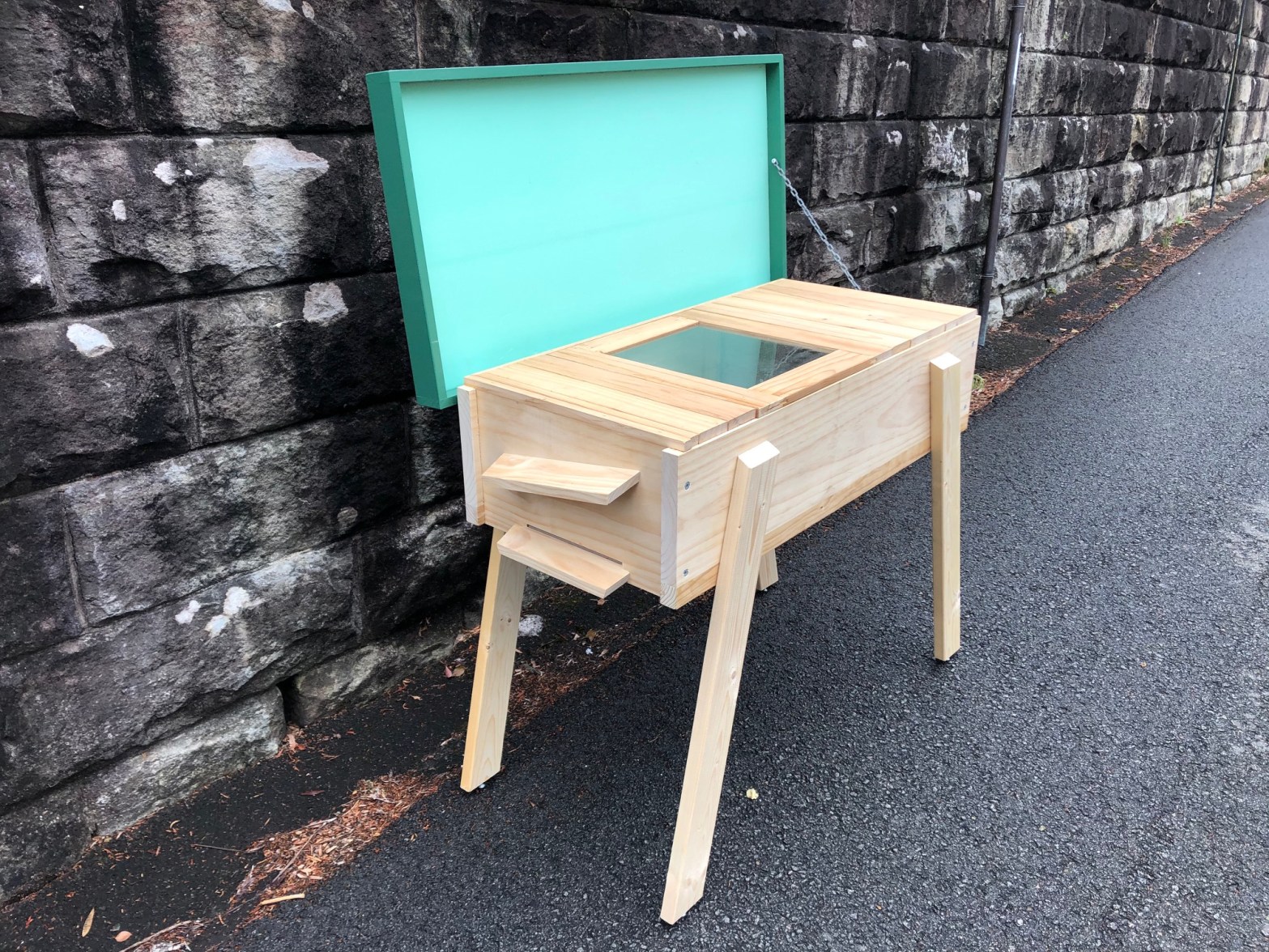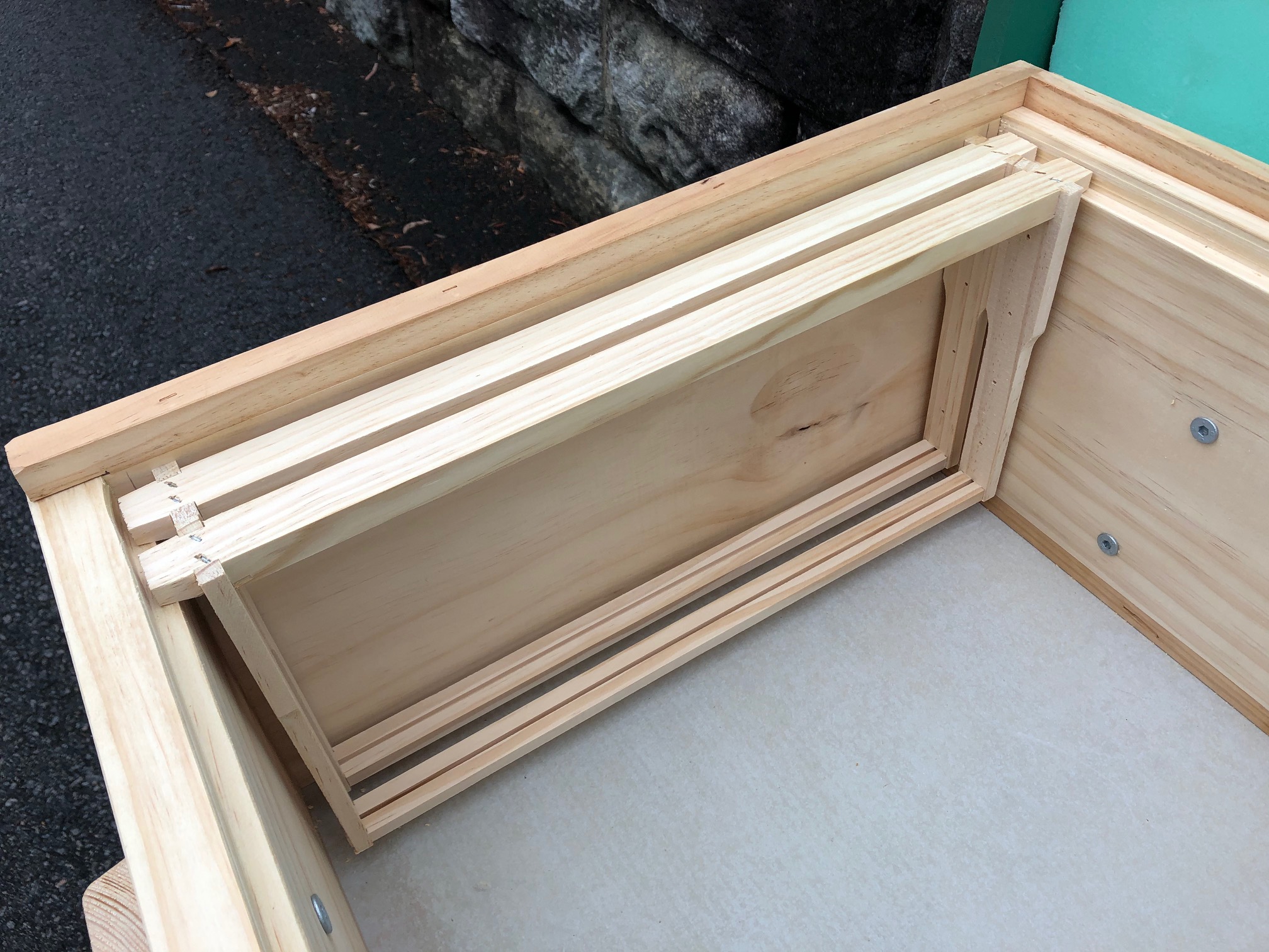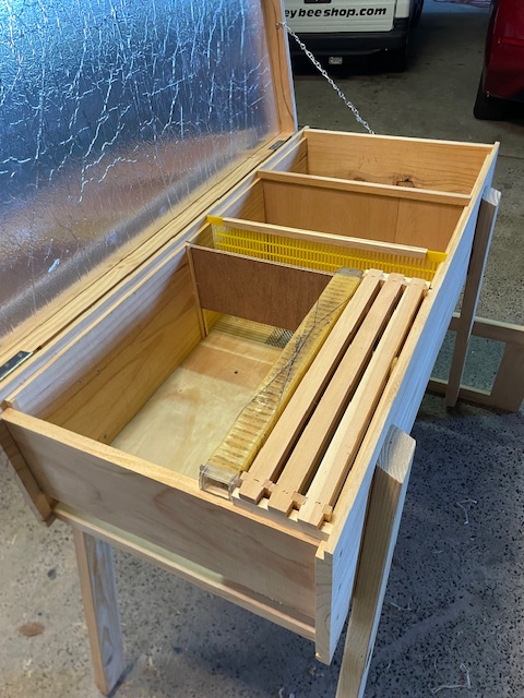 I plan to do a major redesign in the winter for all future hives. It will be made of Formply (cheaper, more weather resistant), will have a full screen bottom (for better Varroa management), will have an optional Chimney (to divert bee traffic higher).