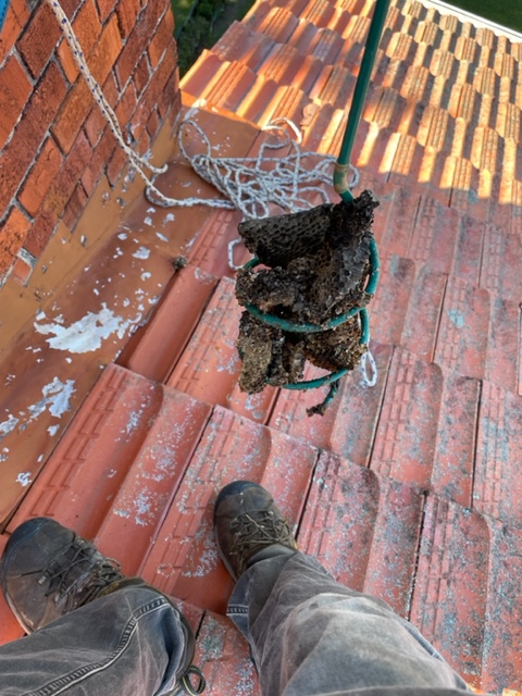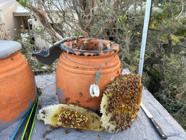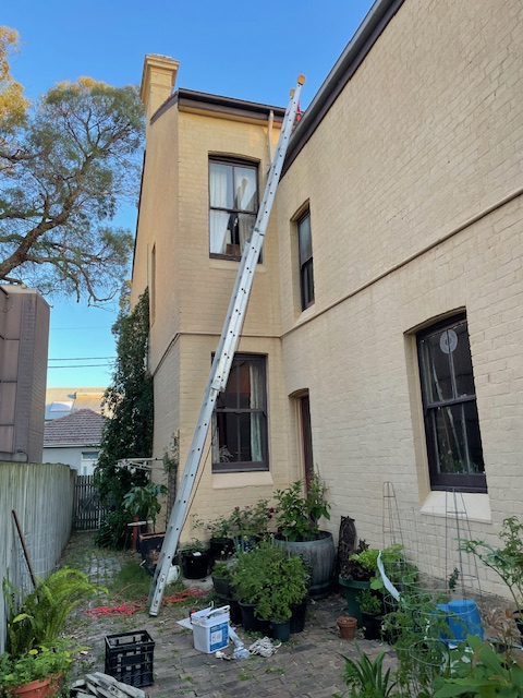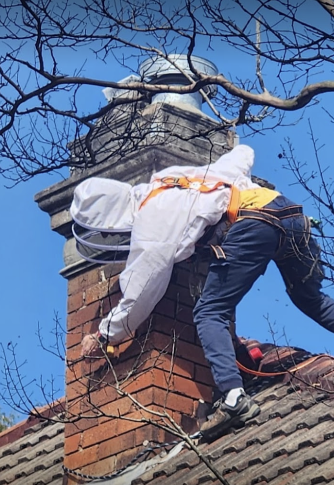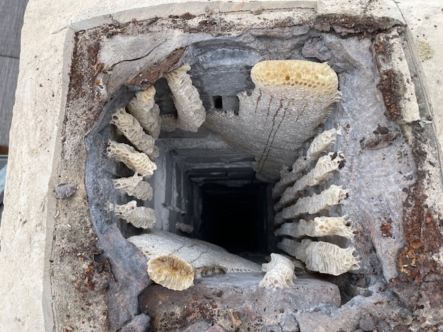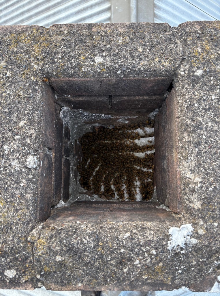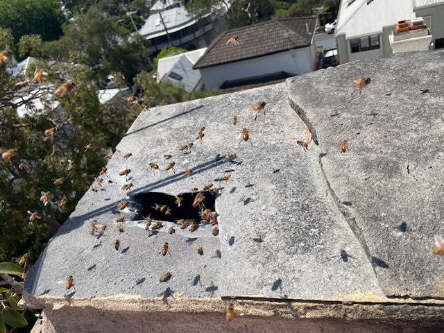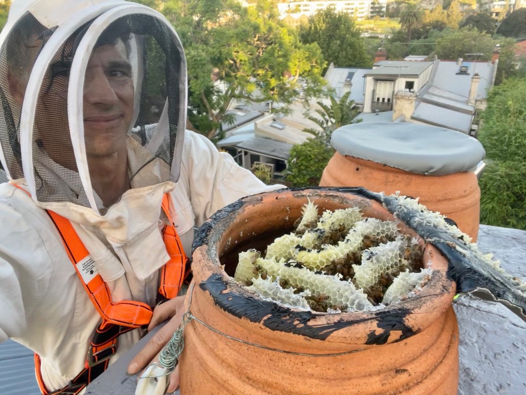 This job was in Mosman. The third chimney-flu had been capped and bees entered through a gap in the mortar. The homeowners found honey leaking out of their fireplace after a 40-degree day. The wax combs had softened in the heat and fallen down the chimney! Over 10kg of honey was left at the top of the chimney, an equal or greater amount must have fallen. We removed the remaining honey, re-pointed the mortar, removed the old TV antenna, installed flashing across the entire chimney, and repainted the chimney while we were up there (steep/slick access on this one…)